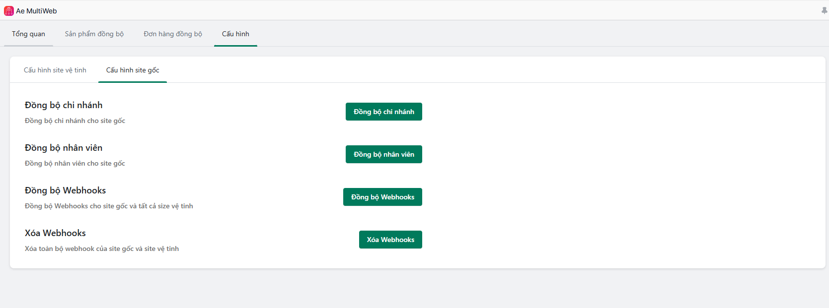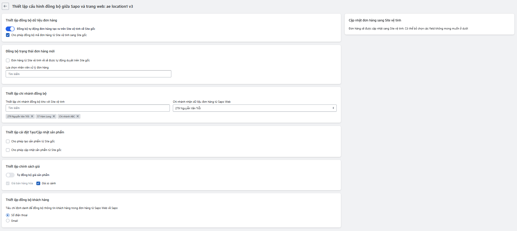 | Thiết lập chi nhánh đồng bộ | (Bắt buộc) Thiết lập chi nhánh đồng bộ kho với Site vệ tinh Chi nhánh nhận dữ liệu đơn hàng từ Site vệ tinh | Sản phẩm trên Site vệ tinh sẽ được đồng bộ theo tồn kho của chi nhánh được chọn |