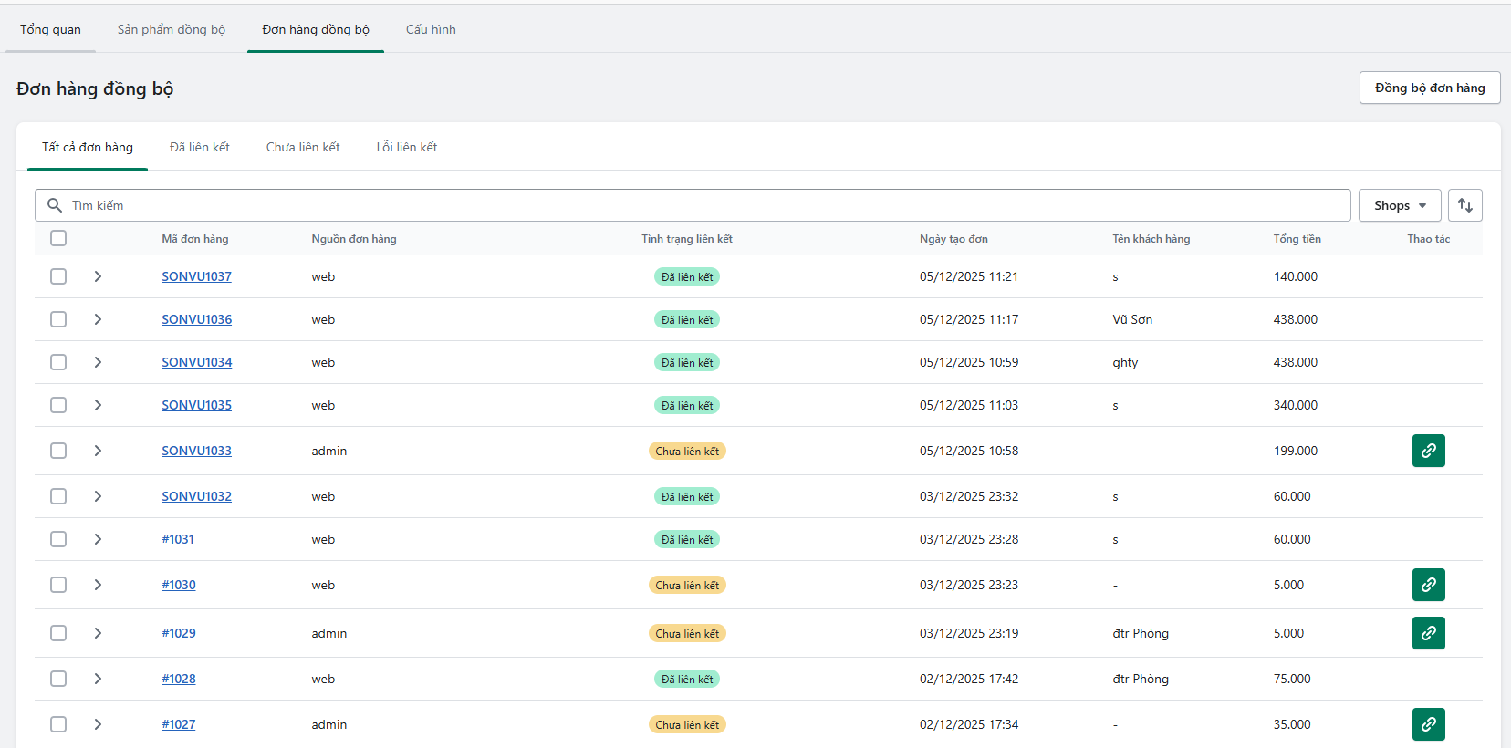 - Chưa liên kết: Đơn hàng tạo mới trên Site vệ tinh nhưng không được đồng bộ về Site gốc do đồng bộ bị tắt