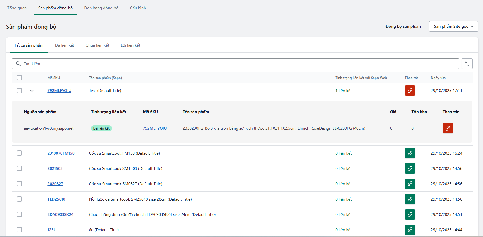 - Đã liên kết: Hai sản phẩm trên 2 hệ thống Site gốc và Site vệ tinh đã được liên kết với nhau qua SKU